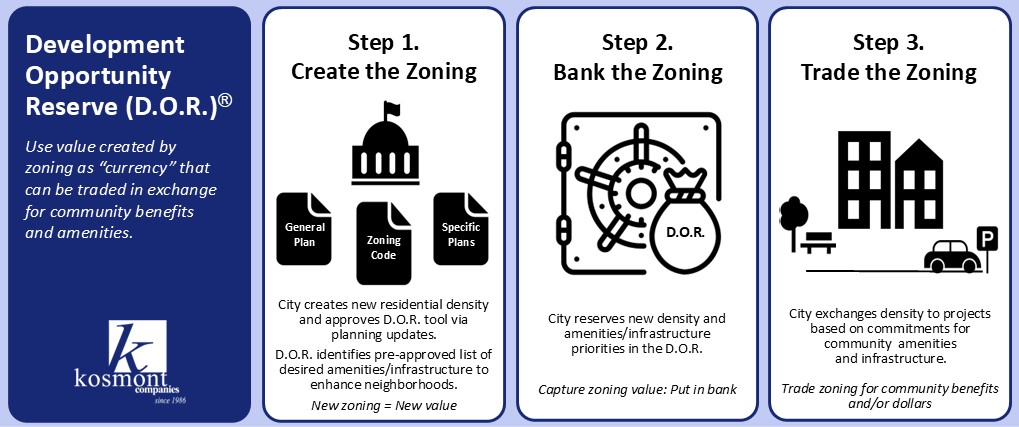 Development Opportunity Reserve (D.O.R.)® is a service provided by Kosmont Companies that enables a City / County to create a “density bank” which can allocate density (or increase in maximum building height, reduction in parking requirement, reduced setback requirement, etc.) to a specific project through zoning (e.g., Specific Plan) as a trade-off for community benefits provided by private investment. Projects meeting the City / County and community’s objectives may receive D.O.R. allocations in exchange for implementing identified priority public improvements (e.g. infrastructure, parks, public facilities, other).
